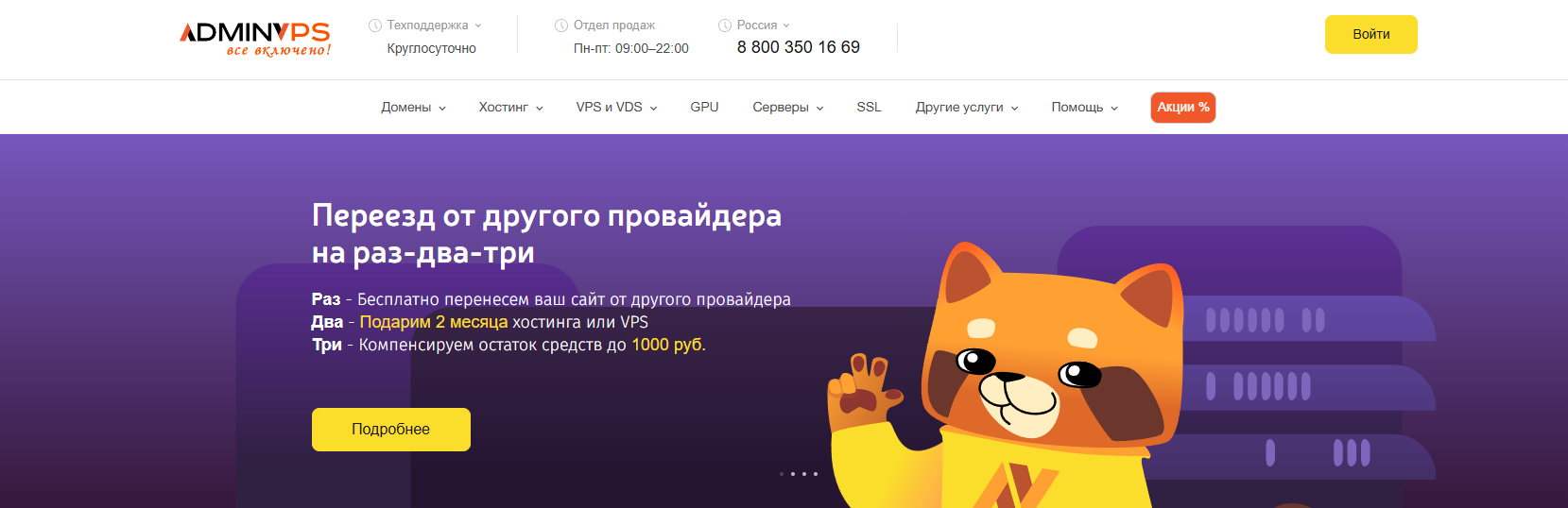 VPS/VDS configurations on KVM with flexible resource configuration. There are separate lineups for specific tasks: GPU servers for machine learning and rendering, Windows VPS, 1C solutions.